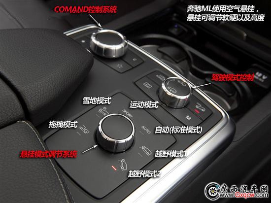 带六种模式的ON&OFFROAD多路况适应系统,是全新奔驰ML350的一大亮点,在不同路况行驶时,可通过中央扶手边的旋转选择不同驾驶模式,其中,六个驾驶模式包括一个自动模式、两个越野模式以及三个常规模式。另外,值得一提的是,全新奔驰ML 350的多路况适应系统包括两级式分动器、纵向差速锁以及AIRMATIC空气悬挂,当整车升至最高时,可以达到285mm的离地间隙,涉水深度可达到600mm,对于一款并不是主打越野的SUV车型而言,这样的成绩具有不错的表现。