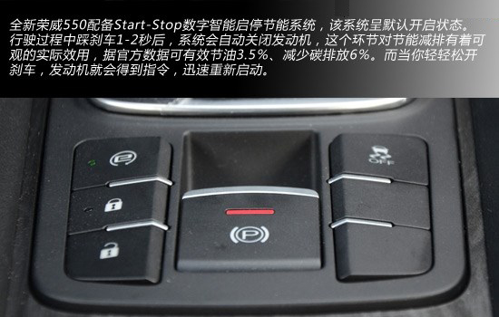 地面道路上,少了大车,但多了不少红绿灯。此时,全新荣威550配备的Start-Stop 数字智能启停节能系统开始发挥功效。该系统呈默认开启状态,行驶过程中遇到红灯踩刹车1-2秒后,系统会自动关闭发动机,这个环节对节能减排有着可观的实际效用,据官方数据可有效节油3.5%、减少碳排放6%。变换绿灯后,只要你轻轻松开刹车,发动机就会得到指令,迅速重新启动。抛却这些数据不说,仅是这个系统操作的便捷性就足以让第一次接触到它的人,感到深深的震撼。当然,如果你不习惯或不喜欢这种操作,大可以提前关闭这个启停系统,操作键则是中控台上方的“e”字按键。