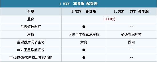 老款尊贵版车型提供了手动挡和CVT车型,而新款则只有CVT车型,售价11.28万,比豪华版贵了10000元。配置上增添不多,后视镜转向灯只在高配车型中出现,让人有些费解。另外,主驾驶座实现了六向调节,卫星导航系统听上去不错,只是不知道实用性如何,整体而言,这款车型并不具备性价比优势。