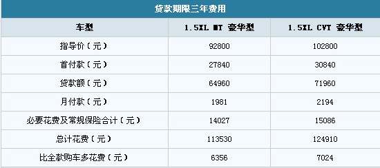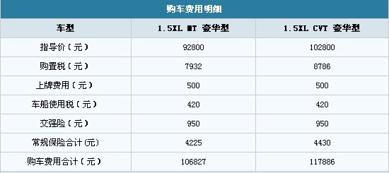 首先我们来看看全款购车需要多少费用。以推荐的1.5XL MT 豪华型和1.5XL CVT 豪华型为例,购车费用明细如下:
