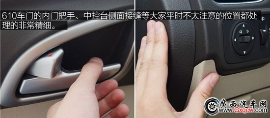 610的车门很厚重,内部用料中规中矩,上面为硬塑料,中间为织布、内门托为皮质、下方为硬塑料。
