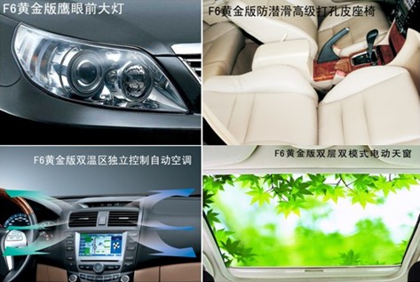 在保证优秀外观设计的同时,比亚迪F6黄金版更专注于车型的超值配置与卓越品质。F6黄金版2.0L CVT尊享型配备了无级变速箱,通过与发动机的完美匹配,实现了零时差加速、零动力损耗、零换档冲击,增强了驾乘的稳定性和舒适性。此外,F6黄金版配备的倒车雷达、三色显距倒车影像监视系统、防静电鲨鱼鳍天线、多功能豪华方向盘、双层双模电动天窗、双温区独立控制自动空调、中文八方向显示防眩目内后视镜、NAVI语音导航系统等众多高端配置,更显高档、舒适,带给消费者舒适、尊贵的驾乘体验。在安全配置上,比亚迪F6黄金版也是追求完美。F6黄金版应用了CAN-BUS总线技术,配置了ABS+EBD、四轮盘式制动、双安全气囊、三段式溃缩吸能转向柱、LED高位刹车灯等安全设备。除此之外,F6黄金版还采用了3H高刚性车身结构,加上整体冲压侧围以及车门内置防侧撞保护杆,全方位抵挡来自外界的撞击,带给消费者更多的安全保障。