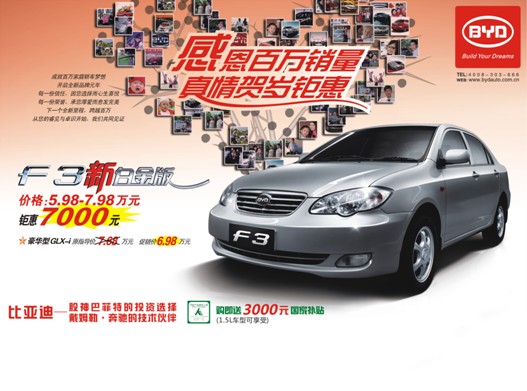 同时,2010年12月10日——2011年1月20日,比亚迪汽车启动 “感恩百万销量,真情贺岁钜惠”活动。活动期间,F3新白金版豪华型优惠7000元,促销价仅6.98万。同时,在促销价基础上,F3全系车型还可享受国家“节能产品惠民工程”3000元政策补贴。