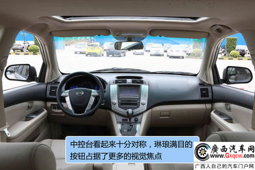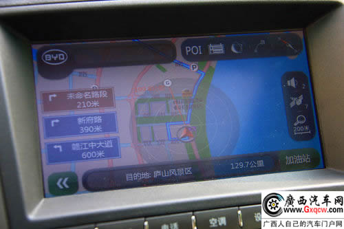 中控台使用了7英寸彩色多媒体显示屏,采用多点触屏技术,分辨率非常高,操作起来非常方便。这个彩色显示屏的功能也很强大,除了传统的DVD播放外,还能观看CMMB数字电视和蓝牙无缝链接手机,而GPS导航系统对于日常用车更为实用。这套导航系统设计得也很人性化,直线行驶时能显示方位以及周边信息,而当进入弯道时会提前在地图显示转弯位置,反应速度比较快,基本上不会让您错过路口。