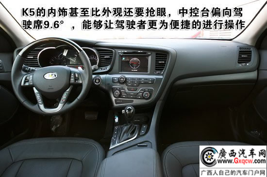 如果笔者要说这是国产中型车最漂亮的内饰之一,恐怕反对的人会很少很少。其内饰造型得分甚至要超越外观得分。大气的中控台造型还有着不错的设计和做工表现,偏向于驾驶席的9.5°设计,目的是让驾驶者尽可能便捷的对中控台上的任何设备进行操作。K5除了提供图示的全黑内饰之外,还有款黑米内饰提供。