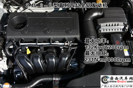 K5提供2.0L和2.4L两款发动机,均为θ-II型直列四缸全铝发动机,具有双VVT和可变进气歧管技术,相同的机器已经在智跑、ix35和即将上市的新索纳塔上有所搭载。2.0L车型最大可输出121Kw/6200rpm,最大扭矩为198N•m/4600rpm,而2.4L车型最大功率为132Kw/6200rpm,最大扭矩达到231N•m/4000rpm。根据工信部出示的油耗数据显示,2.4L自动档车型的百公里综合油耗为7.9L,在中型车里,这已经是一个很不错的数字了。