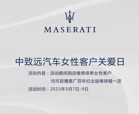 三月的暖阳,给您灿烂的心情;三月的清风,吹开脸上的笑容;三月的花朵,全都为您绽放。在妇女节之际,南宁玛莎拉蒂为所有的女车主送上最真诚的关怀。凡3月7日-9日开车进店保养维修的女客户将获赠原厂百年纪念版棒球帽一顶。