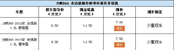 近日,开天力帆店内力帆X60现车销售,颜色可选,目前购车部分车型可优惠1.5万元,感兴趣的朋友可以到店咨询购买,详情见下表: