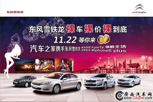 那么问题来了,团购力度哪家强?找东风雪铁龙11.22裸车裸价裸到底,南宁车市一股购车狂欢大派对正席卷而来! 11月22日,汽车之家携手东风雪铁龙举办“裸车裸价裸到底”活动郑重承诺,价格突破底线,全年最低,买贵补差价,不需您劳心劳力砍价,只需动动您的手指,就能轻松获得底价,到店试驾即送法国高档红酒一支!参与活动不仅能享受特惠价格,当天购车还可参加抽奖活动,Iphone6 plus,52电视机,Ipad mini,山地自行车,拉杆箱等等多重豪礼拿到你手软,购车后上传发票还可再获得汽车之家送出的金属质感车标哦!!当天前20名订车的网友均可获赠价值580元的拉杆箱一个。来吧!周末带上您的家人,加入我们的狂欢大派对,吃个够喝个够玩个够!