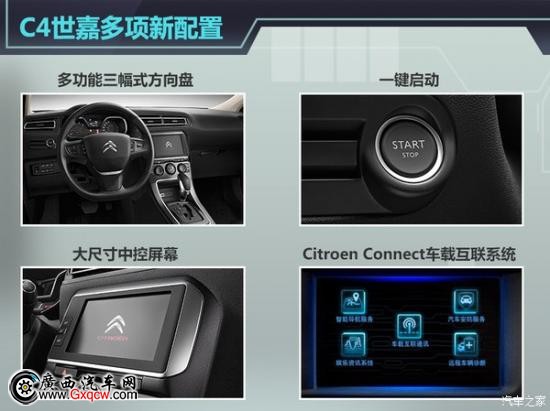 在配置方面C4世嘉再次升级,车辆全系标配了7英寸彩色智能多媒体触屏系统,同时还配备了一键启动 智能免钥匙进入系统,以及集“智能导航、娱乐资讯、汽车安防服务、远程车辆诊断、车载互联通讯”于一身的Citroen Connect车载互联系统。同时,东风雪铁龙C4世嘉还搭载了诸如一键启动、盲区监测等主流配置。