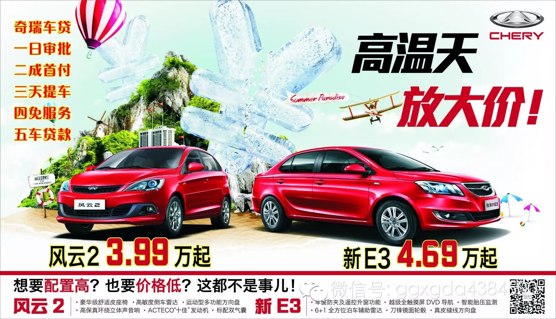 高温天,大放假,奇瑞汽车风云2官方降价3.99万元起售,E3直降10000元,降价后奇瑞E3的最低售价4.69万元,奇瑞当家花旦瑞虎3最低售价6.99万元,更有奇瑞全系车型钜惠,8-15号邀您清凉一夏。