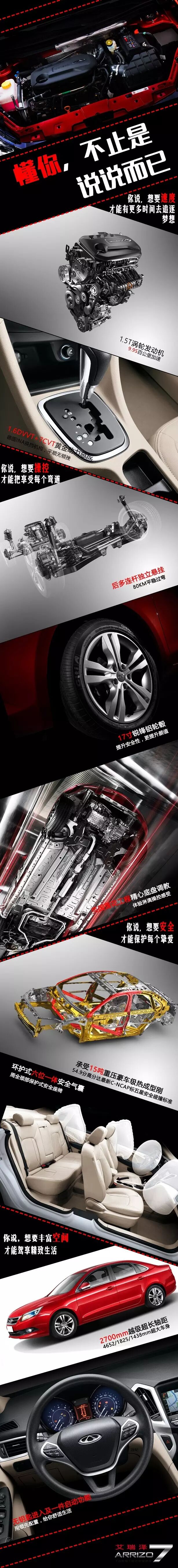 艾瑞泽7也是由”心”出发,它有着一颗百公里加速9.9s的强劲的心;也有着诸如无钥匙启动系统、定速巡航系统、后视镜加热、7英寸豪华级娱乐导航系统等智慧的心;2700mm越级超长轴距带来的4652/1825/1438mm超大车身,多达24处个性化车内储物空间,给你一颗豁达的心。