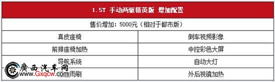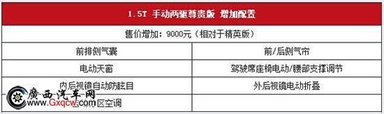 高配的尊贵型比精英型仅仅高出九千元,却配备了电动天窗和自动空调,电调座椅,以及右前盲区可视等高端豪华车型才能拥有的功能,并且能够选装氙气大灯和大灯清洗等功能,安全,方便,非常适合喜欢炫酷的型男和优雅时尚的都市白领女性。