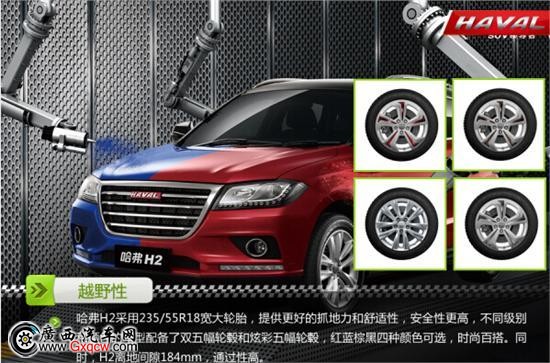 哈弗H2拥有SUV的高通过性,接近角22°,离去角27°,空载离地间隙184mm,哈弗H2采用235/55 R18的宽大轮胎,胎宽与中级SUV相当,同级别**。宽大的轮胎可以提供更好的抓地力和舒适性,安全性更高,可以去更多的地方旅行,提高生活质量。新推出的哈弗H2四驱版提供了专业越野车型的选择,对于喜欢户外越野的车友们是个好消息。