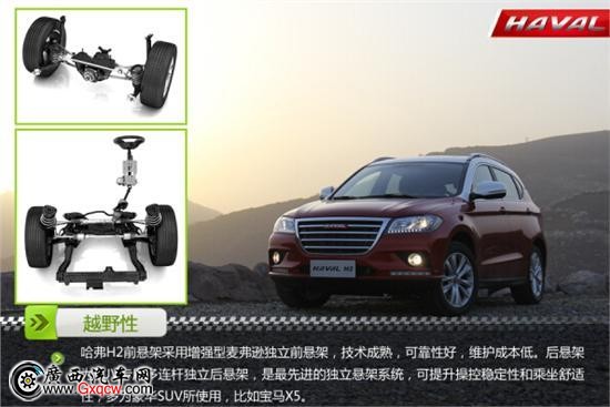 哈弗H2采用双T动力,六速手动变速箱,速比台阶减小,齿比绵密,使得驾驶更平顺、更省油,可以适应更多的路况和驾驶需求。哈弗H2前悬架采用增强型麦弗逊独立前悬架,技术成熟,可靠性好,维护成本低。后悬架为SUV专用的多连杆独立后悬架,更可提升操控稳定性和乘坐舒适性,多为宝马X5等豪华SUV采用。