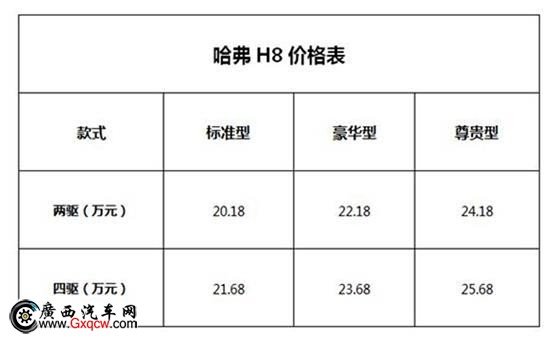 2015年4月20日,越级豪华SUV——哈弗H8在上海车展正式上市。重装上阵的哈弗H8提供两驱和四驱两种款式,分为标准、豪华、尊贵三种车型,市场售价20.18万元起。这是哈弗H8经历两次上市波折后,以更加完美的全新姿态重新上市,兑现了长城人不达高端绝不上市的承诺。详细价格请见下表。