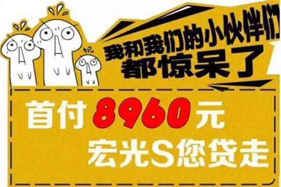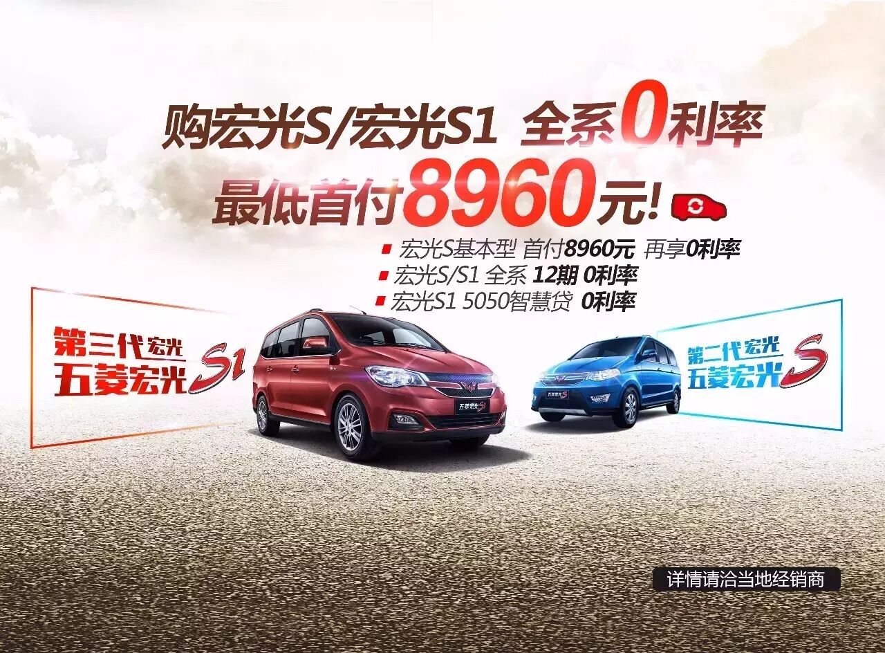 宏光S基本型1.2/1.5L,首付20%,即可享有最低首付8960元和0利率,农村户口更可以只拿收入材料“贷”走爱车。