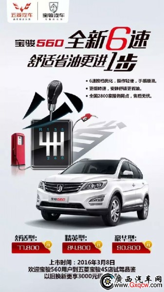 3月8日2016款宝骏560正式上市!共推宝骏560 1.8L 6MT舒适型、精英型、豪华型三款车型,分别售价7.78万元,8.48万元,9.08万元。汽贸园柳州双诚宝骏4S店2016款宝骏560火热预定中!4月30日前置换宝骏560更有3000元惊喜补贴!