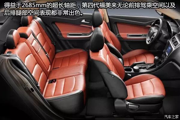 得益于其4698mm的同级最长车身,以及2685mm的超长轴距,福美来可以为驾乘人员带来如同B级行政座驾一般宽敞、舒适的乘坐感受。其真皮方向盘握感舒适、内凹形状的内门板进一步扩大了空间、桶型座椅包裹性强,这些设计在提高车内乘用空间的同时还为广大消费者创造了更加舒适的驾控感受。第四代福美来还配备了宽大厚实、舒适柔软的前后排座椅,采用超纤材质仿皮面料包裹,并由柔软的记忆海绵填充而成的座椅具有腰部支撑、多方位调节等功能,同时座椅两侧凸起的弧形部分还起到优异的支撑及包裹作用,为消费者带来更加舒心、舒适的越级乘坐感受。