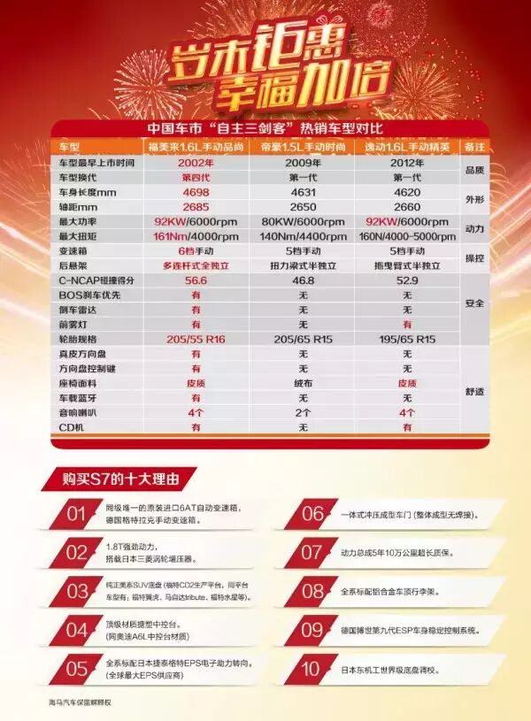 海马福美来和新海马S7超高性价比为您带来了舒适的乘坐感受和超高的安全性,同时,结合购置税减半、优惠贷款等相关政策,此时正是购买福美来和新海马S7的**时机,如果您向往高品质的生活,那么就趁现在把幸福座驾开回家吧。