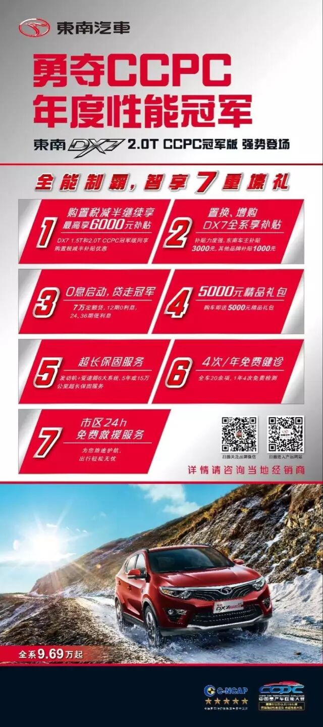 1、凡购买东南DX7 1.5T全系及2.0T CCPC冠军版车型,继续享购置税减半优惠,*高可省6000元;
