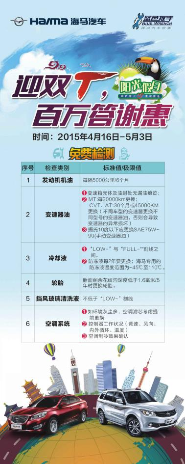 二重喜,阳光假日海马汽车为欢度双T时代即将全面开启,特在2015.04.16-05.03期间开展以“迎双T,百万答谢惠”为主题的阳光假日大型答谢车主活动。