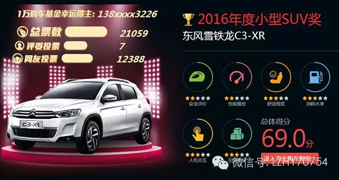 新浪汽车讯 2016年1月20日下午5点,由新浪汽车主办的“年度车2016”评选活动在北京圆满落幕。在本次颁奖仪式上,国内知名车企高层、汽车行业协会领导以及权威汽车媒体代表齐聚一堂,共同见证了“年度车2016”评选各项大奖的颁出。这场由新浪汽车主办的颁奖盛典共设立11个单项奖和1个“年度车2016大奖”,其中东风雪铁龙C3-XR车型获得年度小型SUV奖。