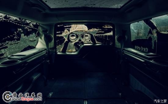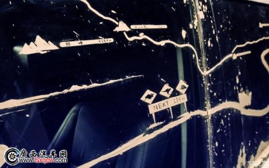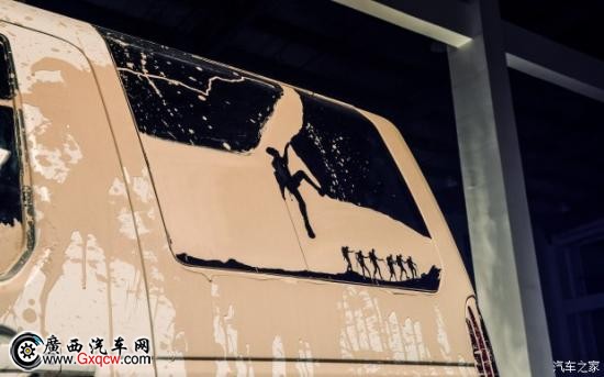 一 位攀登者的形象被绘于车身左侧后舷窗,在他的身后已伫立着无数座高峰,而攀登者依旧继续不断向新的高度进发,象征着路虎第四代发现不断超越自己,登顶座座 山峰的探险精神。画面上还特别标注了几座对第四代发现而言有着特殊意义的山峰,如海拔4,100米的驼峰与4,023米的天山山脉,像一个个荣耀的勋章引 人去回顾曾经的征途。而右面车窗上则如一张探险者手中的地图,上面绘着岩石遍布的崎岖之地,冰雪漫天的苦寒之所,黄沙漫漫的荒芜沙漠和车辙遍布的泥泽地 带。这些平时人迹罕至的地方,正是探险者的乐园,画面上一串浅浅的脚印贯穿期间,象征第四代发现对这类艰苦地形的征服,他就像一个忠实的伙伴随着勇者一路 前行。移步车的后方,后挡风玻璃上,一位手持望远镜的探险家正凝视前方,背对坦途,探索未知,他是发现精神的实体表现。正是这种精神,让多少人坚定梦想, 不断发现,一往无前。