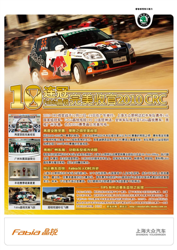 在刚刚结束的12月CRC佛冈赛区,上海大众斯柯达红牛车队再度夺冠,这标志着以Fabia晶锐赛车为主力车型的上海大众斯柯达红牛车队已连续两年、十个分站获得1600cc国家组个人及车队冠军,成为CRC历史上表现最稳定、最出色、完赛率*高的拉力赛车队,Fabia晶锐由此也成为了CRC历史上*优秀的拉力赛车。